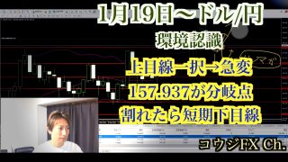 動画有り 【ドル円 1/19〜】窓開きで157.937を下抜け。短期下目線が確定しました こんにちは、木村浩二です。 昨日は日曜恒例の YouTube環境認識動画 を公開しました。まだチェックしていない方はこちらからどうぞ👇 ▶ ■ 今週のドル円(1/19〜) 今朝のドル円は 窓開きオープン となり、重... 2026.01.19 動画有り戦略、思考